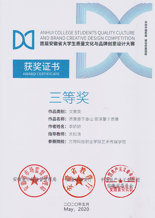 近日,在安徽省市场监督管理局 安徽省教育厅 中国共产主义青年团安徽省委员会关于公布首届安徽省大学生质量文化与品牌创意设计大赛获奖名单的通知中,我校报送的136件参赛作品中,最终斩获大赛一等奖两项、二等奖两项、三等奖五项。其中关松涛老师指导的文案类作品《吃的安心,吃的放心,虾稻米知你心》和《稻米与龙虾合作,营养与美味交融》分获一等奖;关松涛、徐良霞两位老师指导的策划类作品《源启于缘,成于“园”》和徐良霞老师指导的文案类作品《大自然的味道》分获二等奖;关松涛、徐良霞两位老师指导的策划类作品《绿色的你,由“棋”守候》,徐良霞老师指导的平面类作品《绿色生态鲜生活》和文案类作品《棋盘塔,生态中的金字塔》,关松涛老师指导的《品牌来自卓越,安泽成就质量》和《质量重于泰山,安泽重于质量》分获三等奖。关松涛老师被评为首届安徽省大学生质量文化与品牌创意设计大赛优秀指导教师,同时,我校获得优秀组织单位奖。