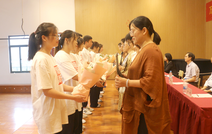 党委副书记、执行校长张进宣读了本次“我心中的好老师”评选活动获奖名单,授予黄吉胜、周璐璐、吕明运、周莹、赵影5名辅导员“益友”称号,授予李想、朱敏、汤丽梅、武秀秀、许莹5名教师“良师”称号。伴随着激昂的音乐,校领导依次为“益友”和“良师”获奖辅导员、教师颁发证书,学生代表上台送上了鲜花和祝福。