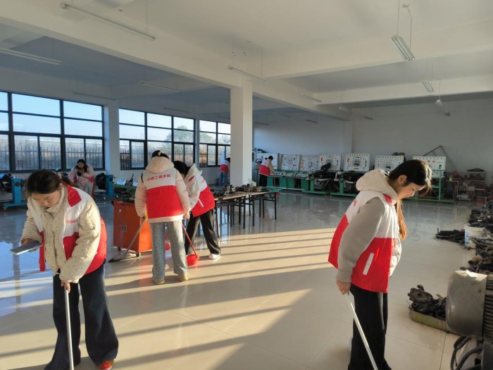 活动中,志愿者们身着红色马甲,全心投入实训楼的清扫工作。他们弯腰清除地面顽固污渍,仔细擦拭实训台的边边角角,小心清理仪器设备上的灰尘与碎屑,认真归类摆放散落的工具零件。大家分工明确、配合默契,从楼道走廊到各个实训室,不遗漏任何一处卫生死角。他们用双手为同学们营造出整洁安全的实训环境,在辛勤付出中收获了满满的成就感,也更加深刻地体会到维护实训空间、支持专业实践的责任与价值。