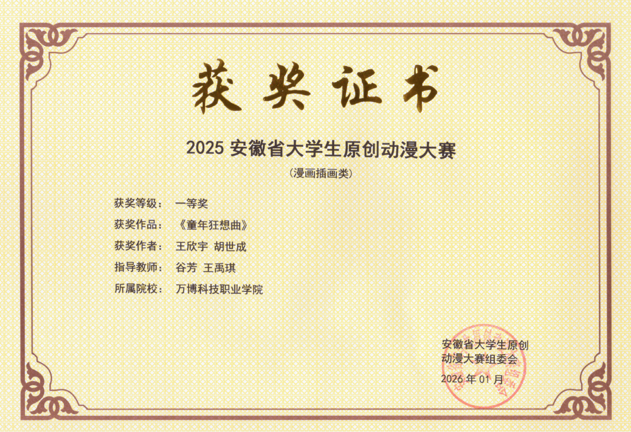 在安徽省大学生原创动漫大赛中,智能信息学院学生王欣宇、胡世成创作的漫画插画作品《童年狂想曲》,在谷芳、王禹琪两位教师的指导下,荣获一等奖。同时,谷芳老师被评为“优秀指导教师”,展现了师生协作、教学相长的良好局面。